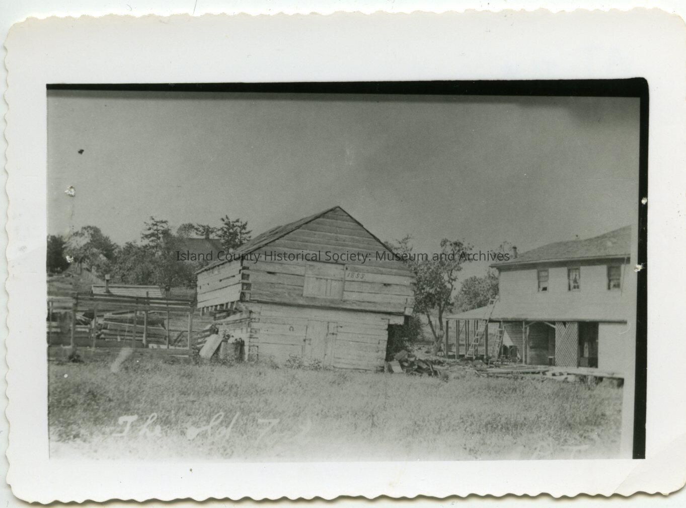 Street-level view of Alexander blockhouse. The blockhouse is two levels with the second story level longer and wider than the first level. It is sided with planks and the roof is shingled. To the right of the blockhouse is a hotel. On the reverse: Island Photo Lab 15 May 1964 Oak Harbor Wash.