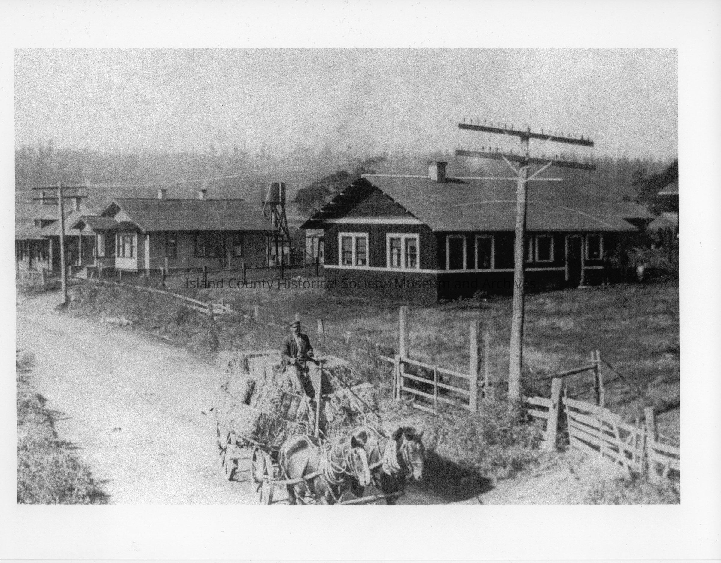 Chas. Wolfson house on corner of NW Pioneer and 60th NW. In front of the house is a team of two horses pulling a wagon full of hay. In the background is a watertower.Made/Created