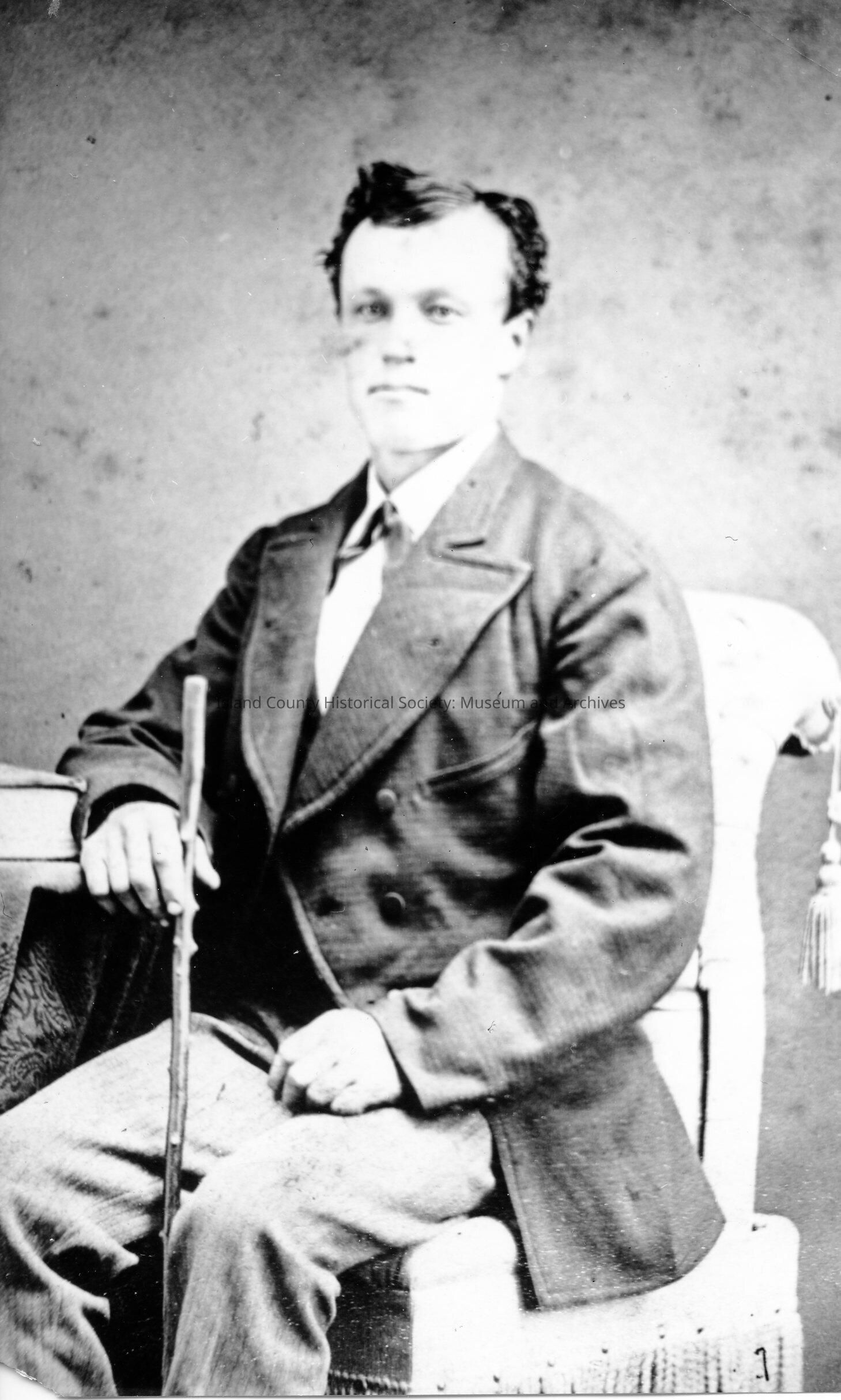 Portrait of Jacob Jenne seated wearing a suit and holding a walking stick.