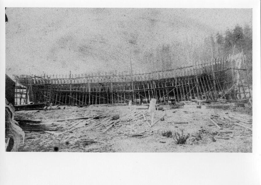 Ship in the process oof being built, hull framework is shown. Likely a Lovejoy boat.