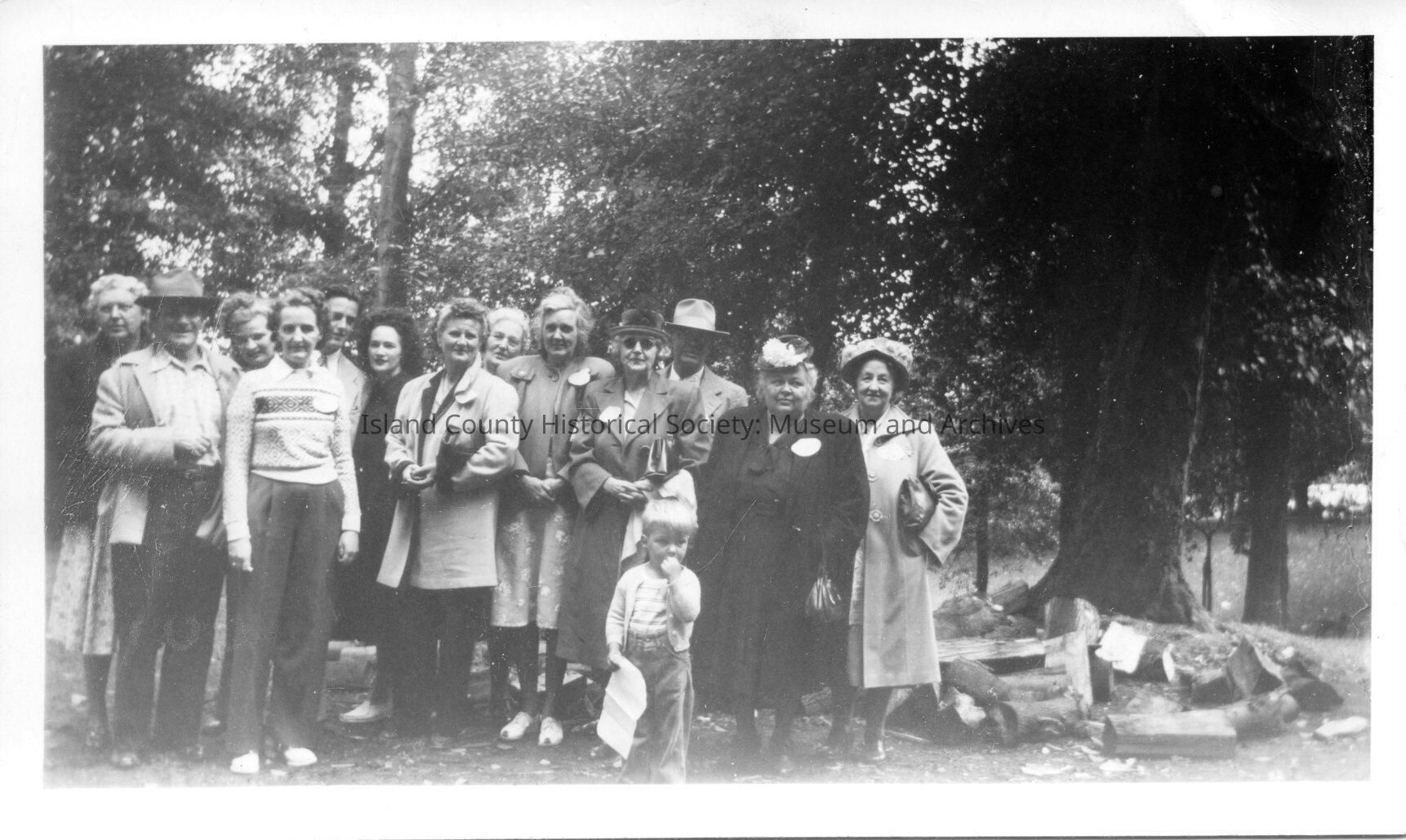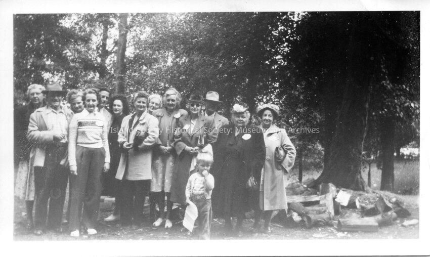 Group of people at Coupeville Old Timers Picnic on 15 Aug, 1948. The group is made up mostly of decendants of the pioneers to the island. Large group of people lined up for a photo with a small boy in front of them.