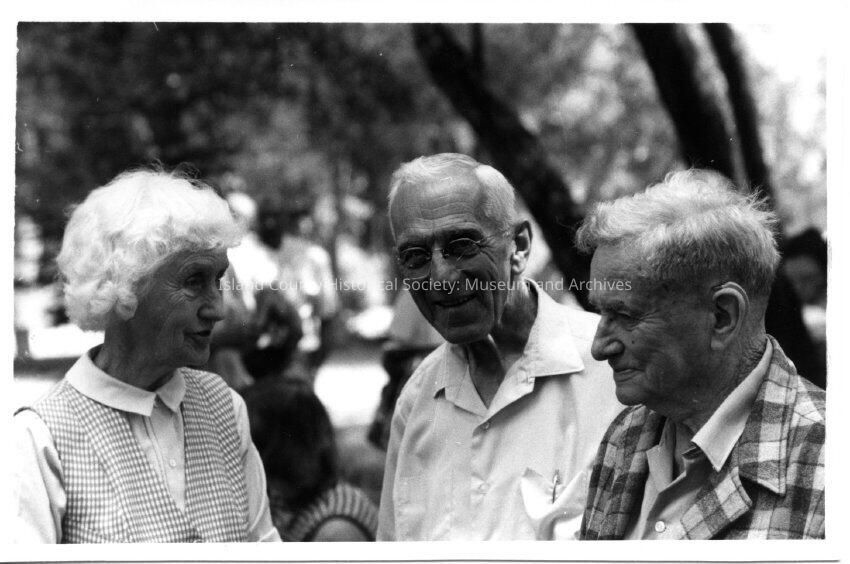 Group of people at Coupeville Old Timers Picnic in 1968. The group is made up mostly of decendants of the pioneers to the island. Two men and one woman are standing together.