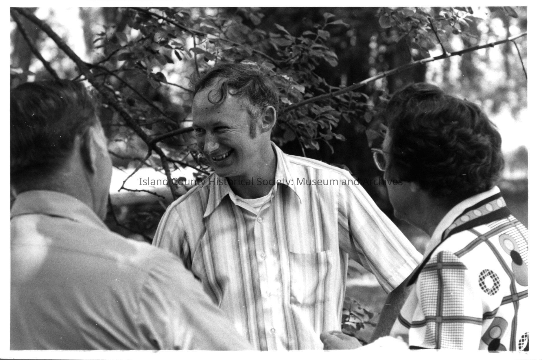 Group of people at Coupeville Old Timers Picnic in 1968. The group is made up mostly of decendants of the pioneers to the island. Group of two men and one woman (Evelyn Johnson?) standing talking. Man in center is David Engle who later founded Coupeville 4 Square church.