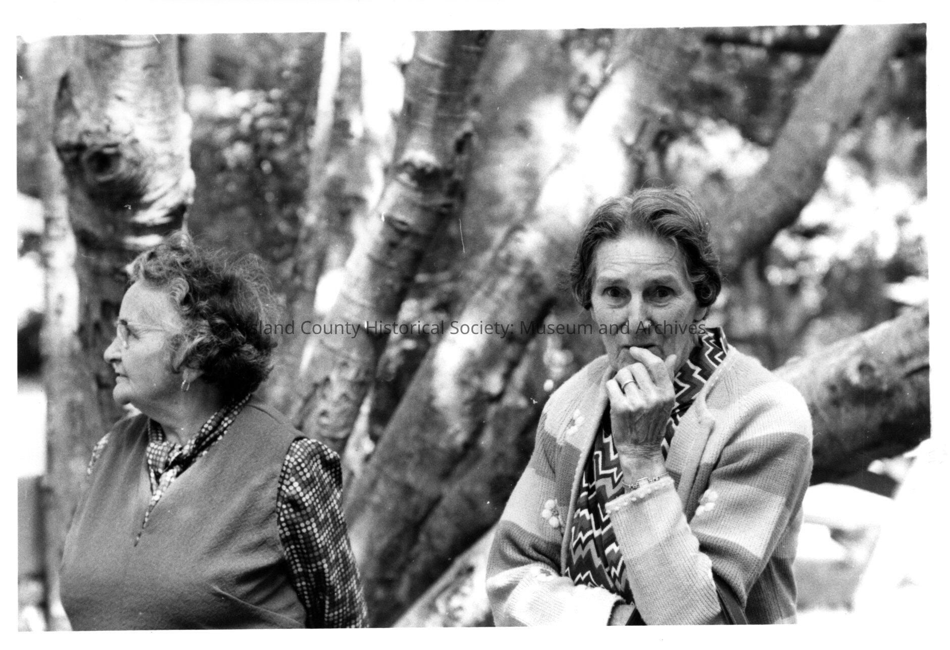 Group of people at Coupeville Old Timers Picnic in 1968. The group is made up mostly of decendants of the pioneers to the island. Two women sitting next to eachother under a tree. Madeline Darst on right, Bernice Reed on left.