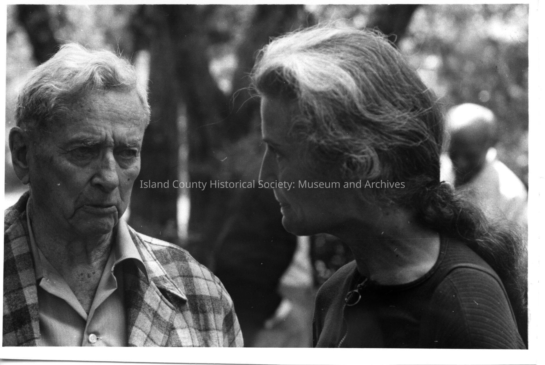 Group of people at Coupeville Old Timers Picnic in 1968. The group is made up mostly of decendants of the pioneers to the island. Carl Gillespie and Joan McPherson standing talking to eachother.