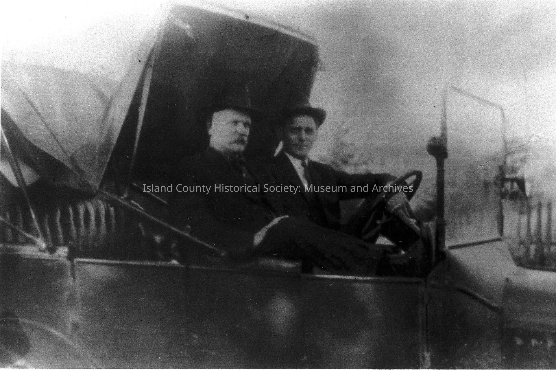 Coupeville Fire Department. George Mitchel, Deputy and Bill Gookins, Sheriff riding in a very early car together. Donated by Gordon Gookins. Per note on front this was accessioned as 2007-004-002 but it is not the photo in that entry in PastPerfect.