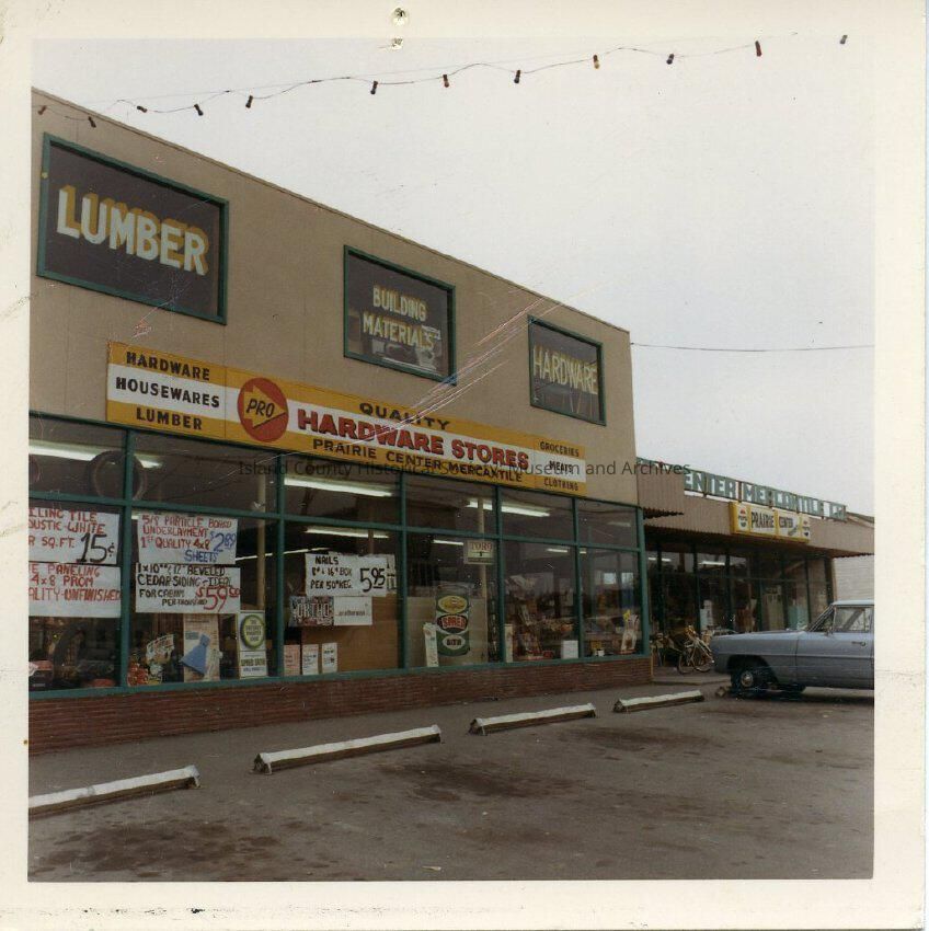 Front entrance to the Prairie Center Mercantile Co. showing storefront windows of the hardware store side of the mercantile. Stamped on the back: Rev. Truman Cotten, Methodist Church. Sept 66