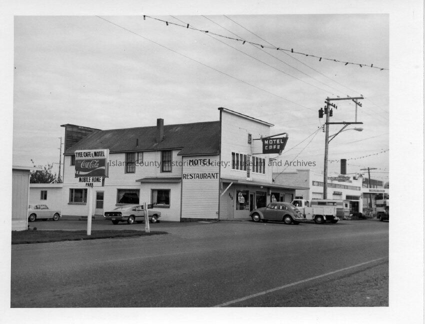 Side and front view of the Tyee Cafe and Motel, a few cars are parked around the building, a sign attached to the front reads: Motel Cafe.