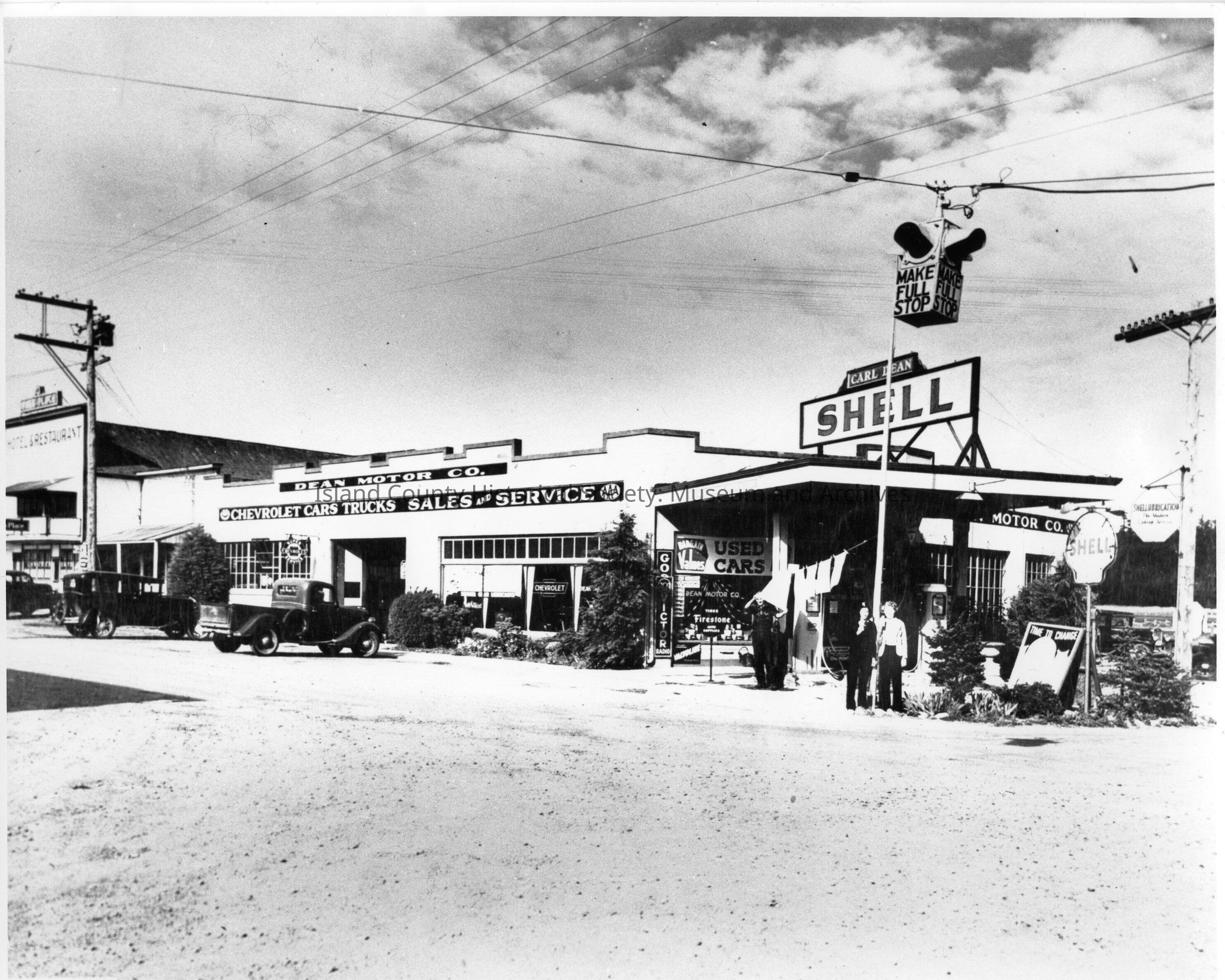 Front and side view of Carl Dean Shell Station by Tyee motel and restaurant. Three men are standing out front where the gas pumps are.