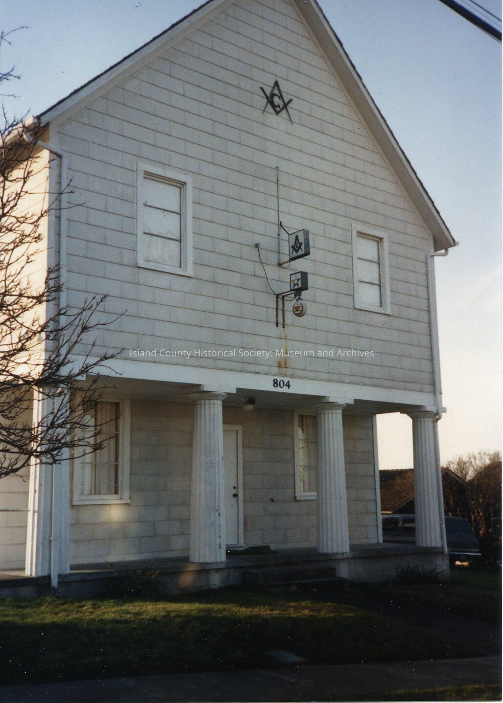 Front view of the Masonic Lodge in Coupeville with two symbolic signs.