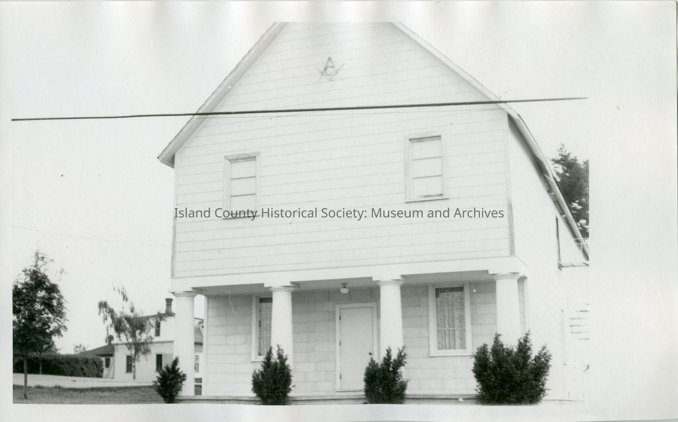 Front view of Masonic Lodge, Mason symbol is displayed toward the top of the face of the building. Taken 1971.