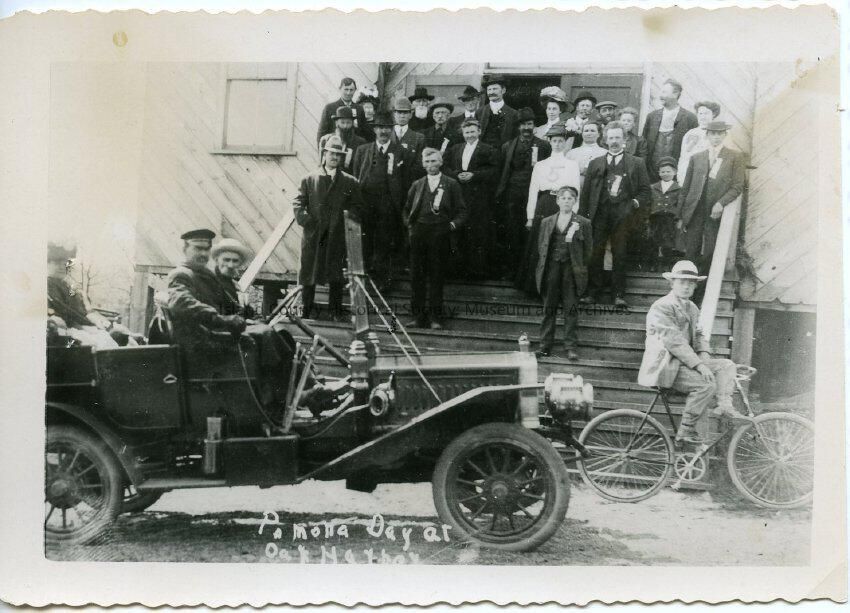 Pamona days in Oak harbor, C. Wolfsen car. A large group of people stand on the steps of a building behind the car watching. At the foot of the steps a young boy is sitting on a bicycle.
