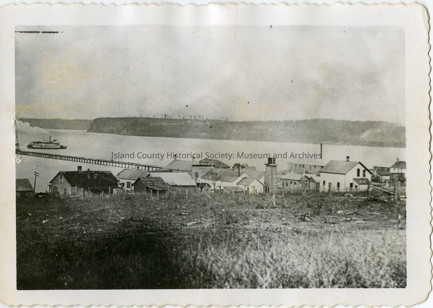 View of the town of Oak Harbor from the rooftop of a building, in the background the SS Fairhaven can be seen.