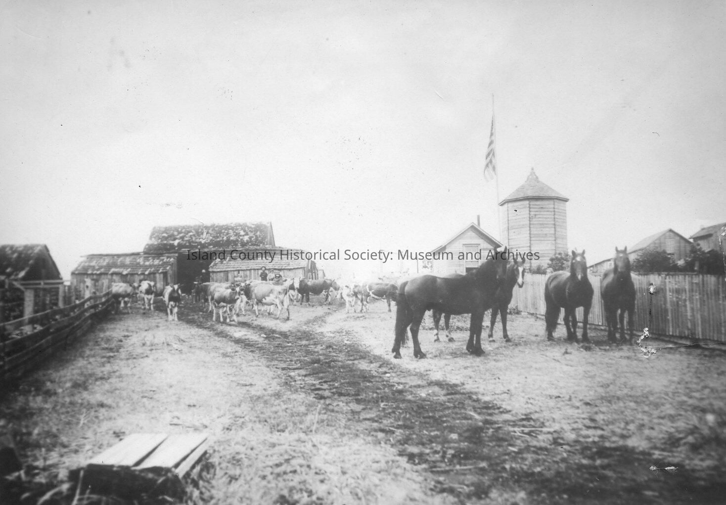 The Ely farm showing many outbuildings, cows and horses, in the background is a silo.