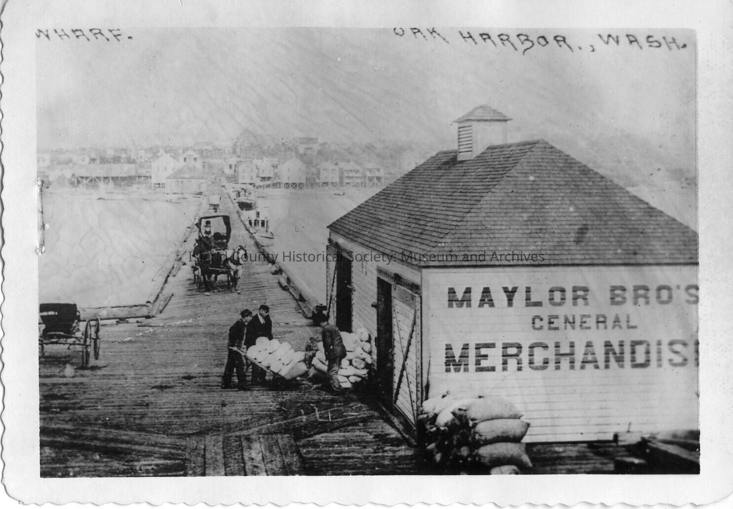 Maylor Bro's General Merchandise at the end of Maylor's dock. The general store is being loaded with supplies by three men.