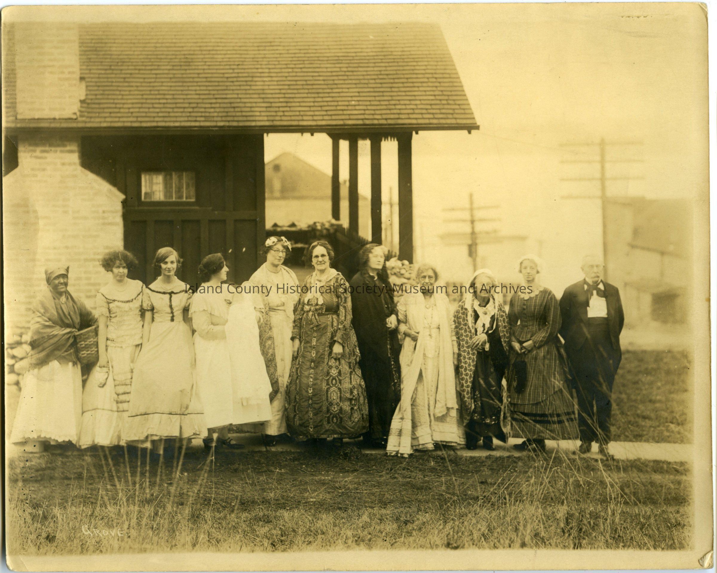 Photograph of men and women. All are in costume as the pioneer families. This was probably a re-enactment of the settlement or pioneer times. Names are written on the back as follows: