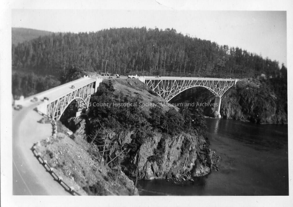 Photograph of Canoe Pass Bridge in foreground and Deception Pass Bridge behind. Viewed from above the north lookout area on Fidalgo Island looking down onto the road, slightly different angle from 2013.088.020. Written on back: "July 9, 1939". Given by Anna K. Eason, daughter of Sterling E. Anderson, who took the photos.Made/Created