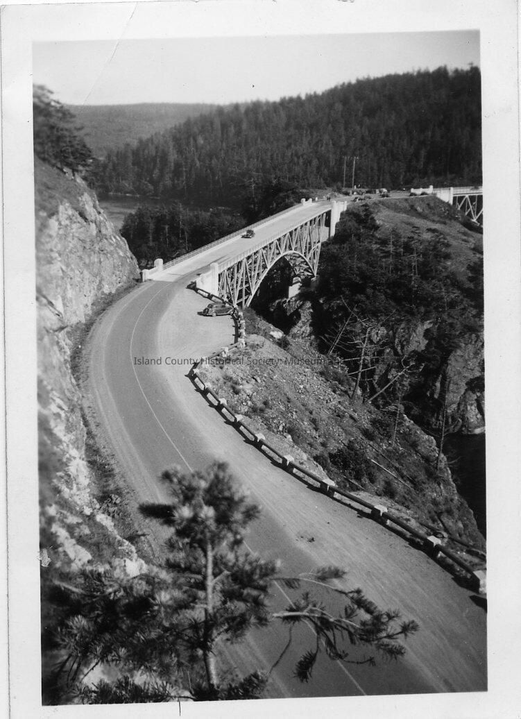Photograph of Canoe Pass Bridge in foreground and Deception Pass Bridge behind. Viewed from above the north lookout area on Fidalgo Island looking down onto the road. Written on back: "July 9, 1939". Given by Anna K. Eason, daughter of Sterling E. Anderson, who took the photos.Made/Created