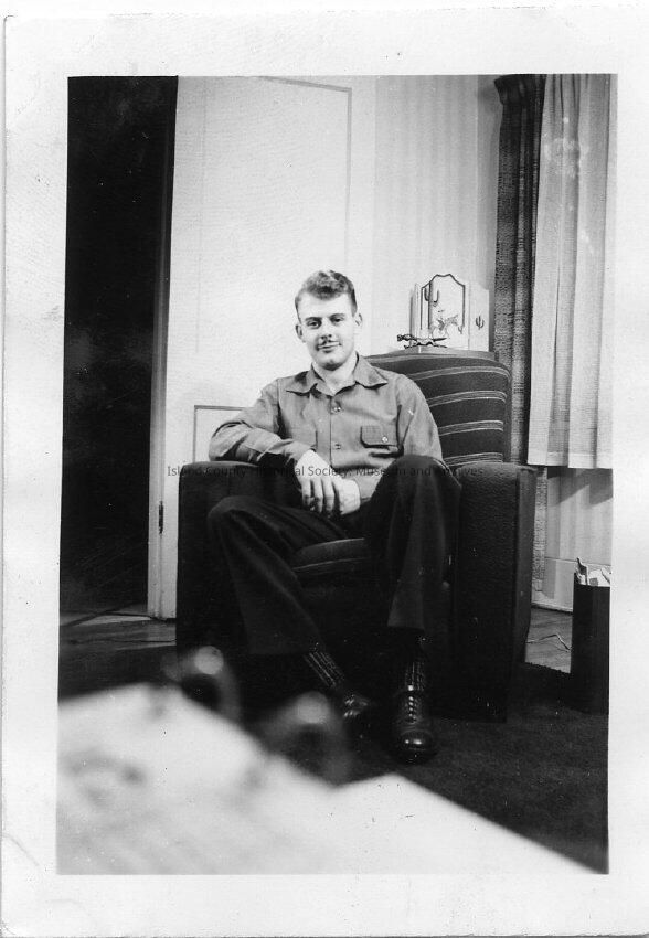 Photograph of Freeman Boyer, Jr. Coupeville, Wash. 1942. Has a mustache. Sitting on striped arm chair, next to window with drape, picture of cactus in background on table. Small animal running scupture on the table. Wearing button-up shirt, patterned socks, dark shoes. Possibly calendar in a binder in foreground - has metal page turning loops. Written on back: "Freeman Boyer Jr., Coupeville, Wash. 1942". Given by Anna K. Eason, daughter of Sterling E. Anderson, who took the photos.Made/Created