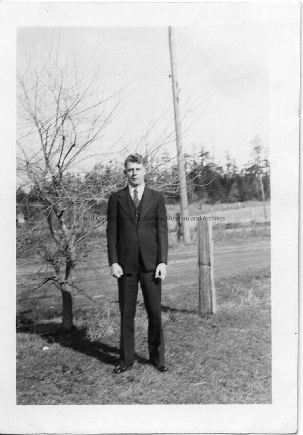Photograph man in dark suit, white shirt, tie. in front of a bare tree and a utility (electrical) pole and dirt road.Written on back: "Coupeville, Wash. 1942". Given by Anna K. Eason, daughter of Sterling E. Anderson, who took the photos.Made/Created