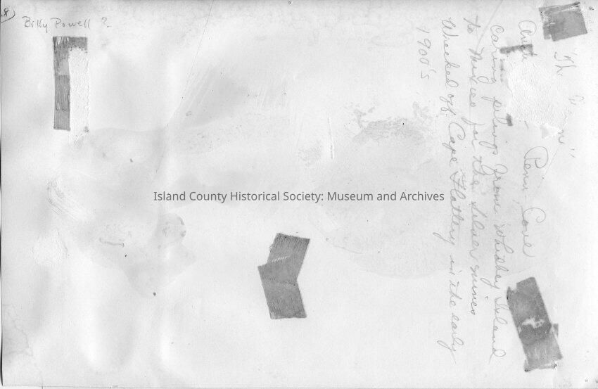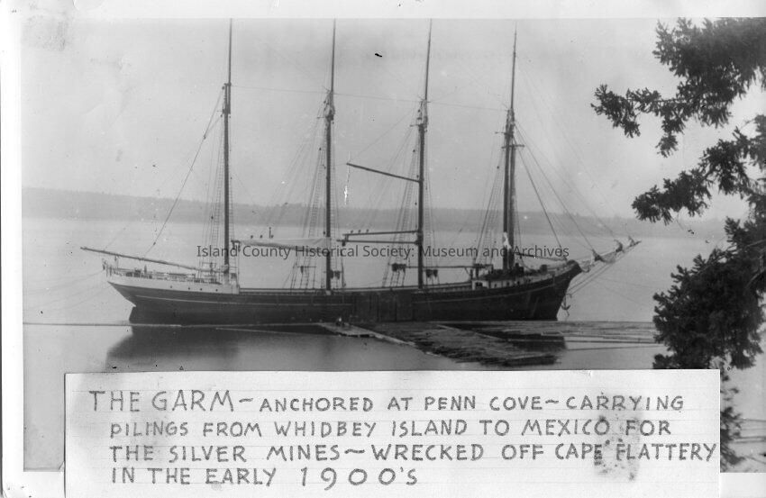 "The Garm- anchored at Penn Cove- Carrying pilings from Whidbey Island to Mexico for the Silver Mines- wrecked off cape flattery in the early 1900's." A four masted schooner anchored near shore. There are log rafts off the side of the boat waiting to be loaded. A few men can be seen standing on a platform next to the boat and logs. There are some tree branches that frame the right of the photo. The caption is hand written and glued to the photo. The back states repeates the front caption.