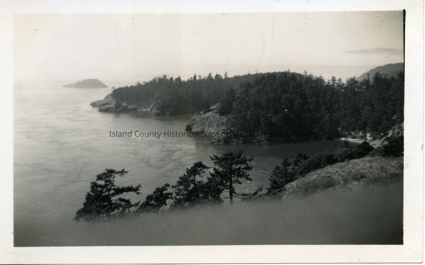 The black and white photo shows a view of rosario beach, and was taken from Deception Pass bridge. This photo appears to have been taken from behind the railing on deception pass bridge because in the bottom of the photograph the railing is blurred. On back: At Deception Pass State Park near Anacortes, Wash. - Sept 1937. "204"