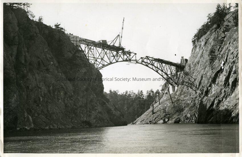 The photo is black and white and shows the development of Deception Pass bridge. The span that is being built is likely Canoe Pass. On either side of the newly developed bridge are landforms that have bundles of trees. Halfway through the constructed bridge shows a large crane.