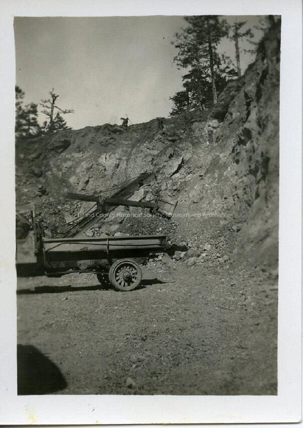 The black and white photograph shows a steam crane(not pictured) dumping dirt onto the back of a truck. In the lower left hand corner there is a shadow and behind the truck there is a hill with trees.