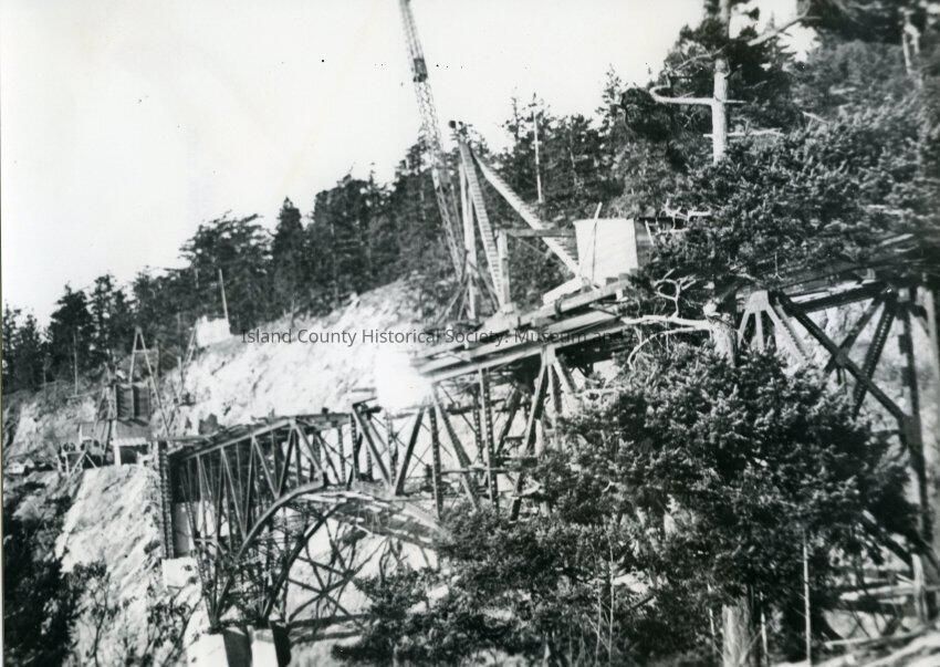 The black and white photo shows a close up of the Canoe Pass bridge span construction. At the point when the photo was taken the photo had almost been done, there is a small opening in the bridge. Near the opening is a large crane and part of a building. On the left side of the photo there is another crane. In the background there is bundles of trees.