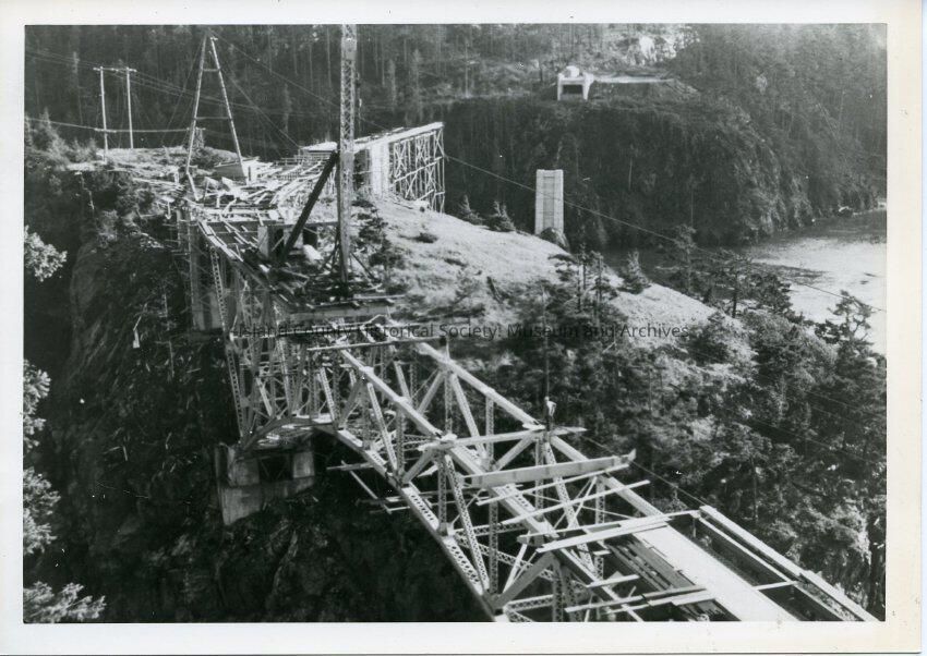 The black and white photograph shows a close up of the Canoe Pass bridge span construction. There is a large crane that is upon the span itself and in the background you can see wires coming off of the Deception Pass bridge span. On the back: Building the Deception Pass Bridge 1934; From Fidalgo.