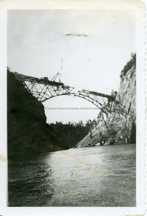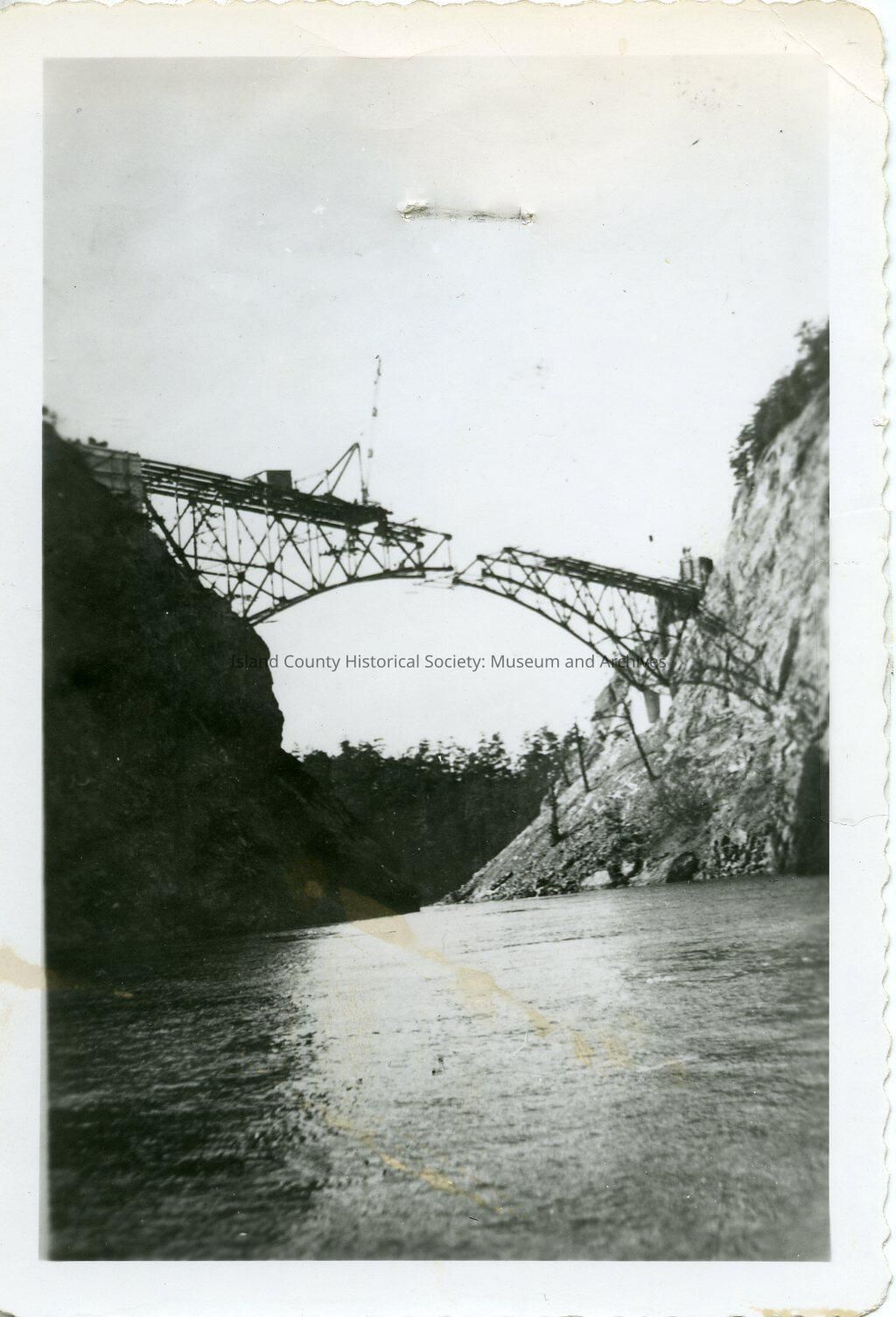 The photo is black and white and shows the development of Deception Pass bridge. The span that is being built is likely Canoe Pass. On either side of the newly developed bridge are landforms that have bundles of trees. Halfway through the constructed bridge shows a large crane.