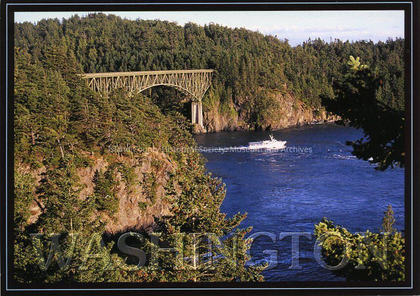 This colored photo shows a view of deception pass bridge. Below the bridge is a speedboat, on the left side of the photo shows a cliff that has many trees on top of the cliff.