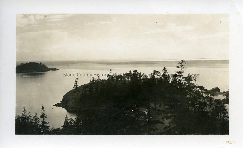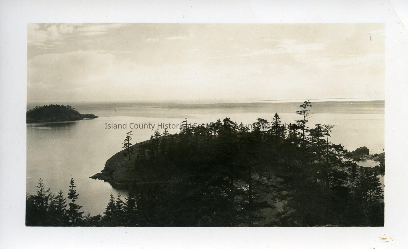 This black and white photo shows a view of the islands, taken from deception pass bridge, trees in the bottom of the photo. On the back: 1940 - near Deception Pass "374"