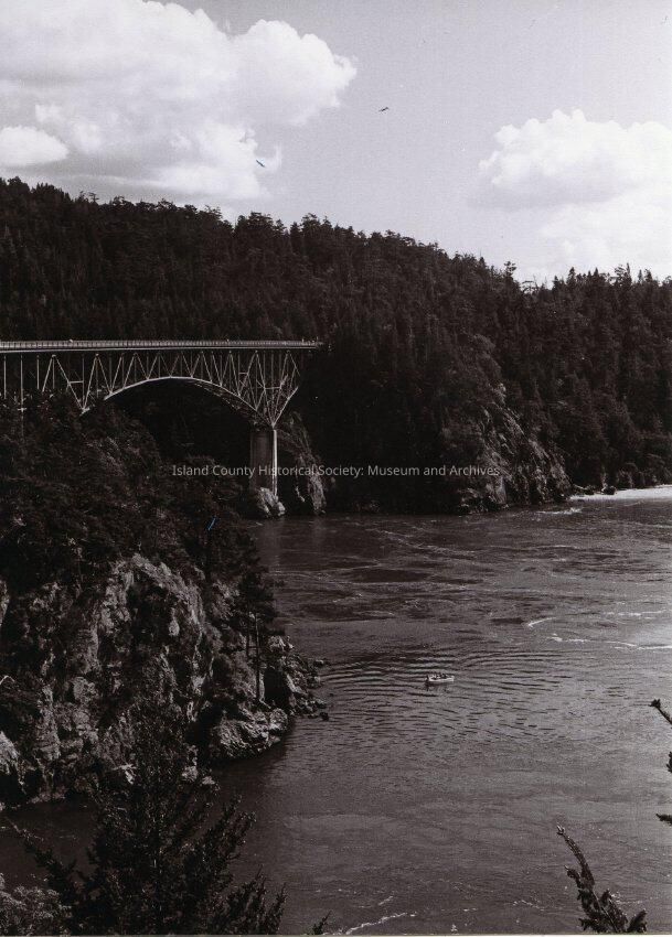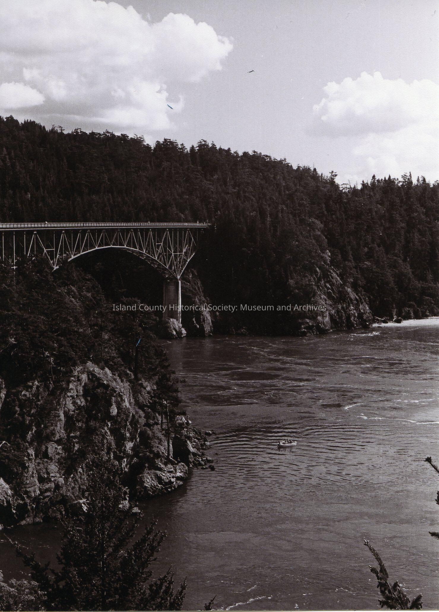 This black and white photo shows a view of deception pass bridge. Next to the cliff is a small fishing boat that has three people in the boat.