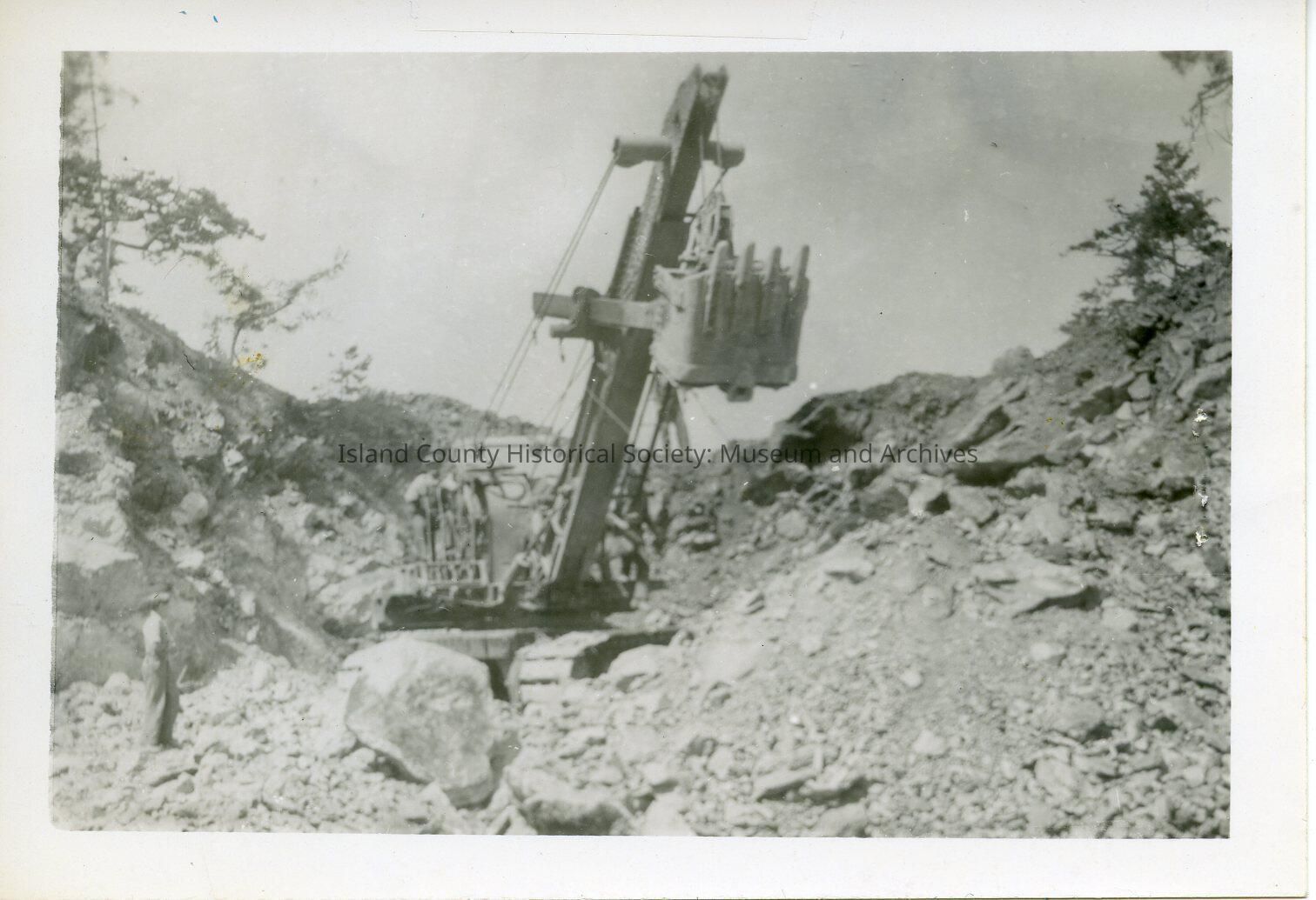 This black and whtie photo shows a large digging crane that is picking up dirt. On the back of the crane shows one person who is opporating the crane. On the left of the photograph there is a man standing, next to him are two large rocks.
