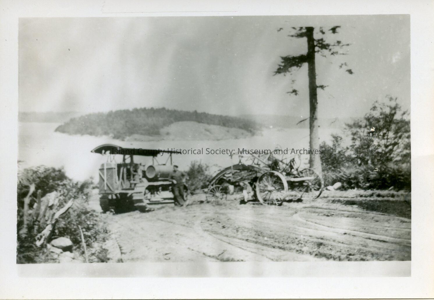 Photo possibly from the construction of Deception Pass Bridge (making roads). There is large machinery in the foreground and a man leaning against the machine on the left. The island in the background of the photo could either be Whidbey Island or Pass Island. There are cleared trees and brush on the left side of the photo.