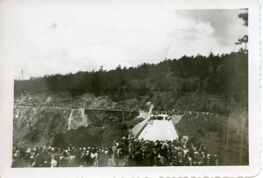 There is a crowd gathered for the opening of the bridge. On either sides of the bridge are groups of people. Beyond the group of people in the distance there are trees and another bridge. At the end of the other bridge there is huge plastic covering that end.