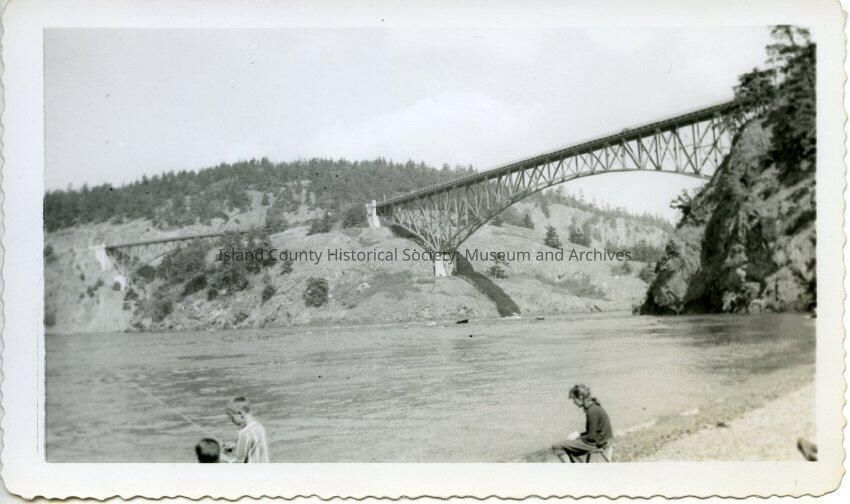 The black and white photo shows the deception pass and canoe pass bridge spans. The foreground shows three people, two of whom are fishing and the other one is sitting in a chair. The land formations that are supporting the two bridges have trees.