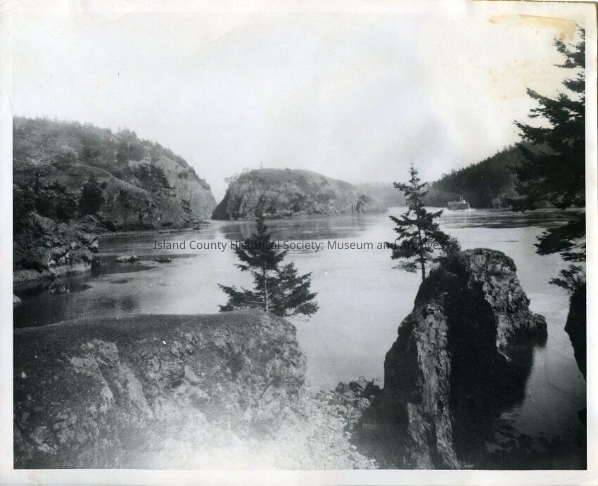 The black and white photograph shows the deception pass area before the bridge was built. The bottom of the photo shows a large rock that has a small tree sticking out in front of it, the rock next to that has another small tree sticking out in front. The right side of the photo shows a tiny portion of a large tree. The background has three large land formations that will later be the support for the bridge and beyond that are trees. A large boat/small ship is on the right side.
