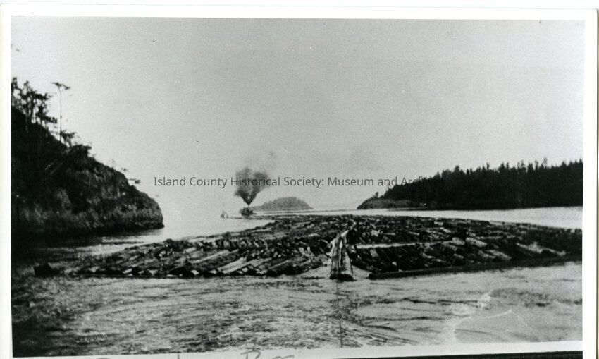 The black and white photo is a view of a steamboat. The bottom half of the photo shows water and several logs in a systematic order. The left side of the photo shows an island with several trees on top of it. The right side of the photo a silhouette of an island with trees on top of it. The background shows a steamboat with smoke above it. Beyond the steamboat is a fading island.