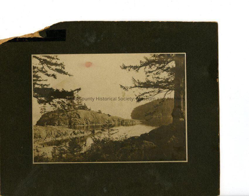 The black and white photo is a view of Deception Pass. The bottom of the photo shows several small trees and land that is sloping up from the left to the right of the photograph. The left side of the photo shows a person laying down on the beach with their dog and a rocky landformation that is stretched out to the middle of the photograph. Above the landform is a tree of several tree branches sticking out. The right side of the photo shows a large tree and a silhouette of an island with several trees on top of it. The background shows a rocky landform that is stretched from the left to the right of the photo and has several trees of various sizes on top of it.