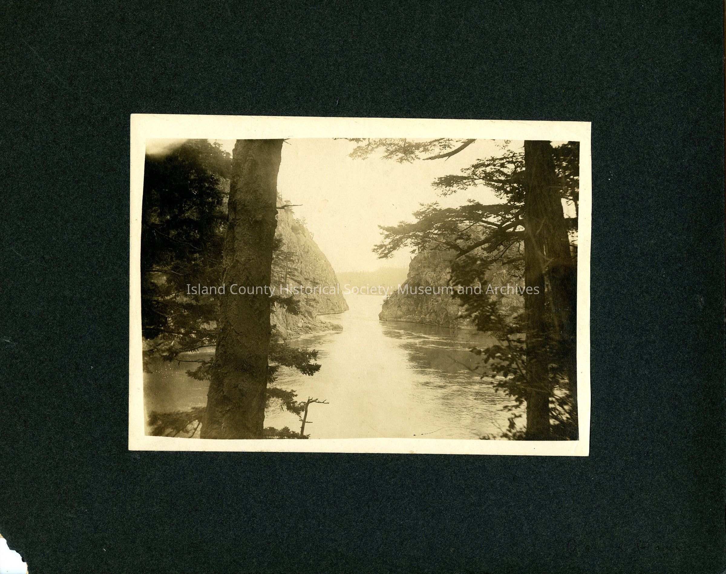 The black and white photo is a view of Deception Pass prior to the bridge. The bottom half of the photo is a view of two trees and water. The left side of the photo shows an island that is peaking through the large tree. The right side of the photo shows a rocky landform that is poking through the stems of the tree. The middle of the photo shows a wavy opening between the two landforms.