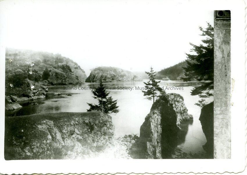 The black and white photo is a view of Deception Pass. The bottom half of the photo shows two large rocks with small trees coming from the tops, and one large tree on the right side of the photo. The top half of the photo shows two islands on the left side of the photo and several rocks next to the big island. The right side of the photo shows another landform that can only be seen by a glimpse behind the tree.