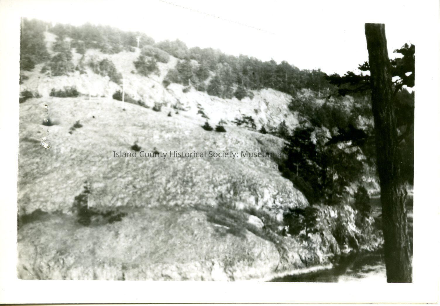 The black and white photo negative is a view of Goose Rock at Deception Pass. The photo shows one large island of Deception Pass. The top portion of the island is covered by trees. On the right side of the photo there is a large tree and many tree branches.