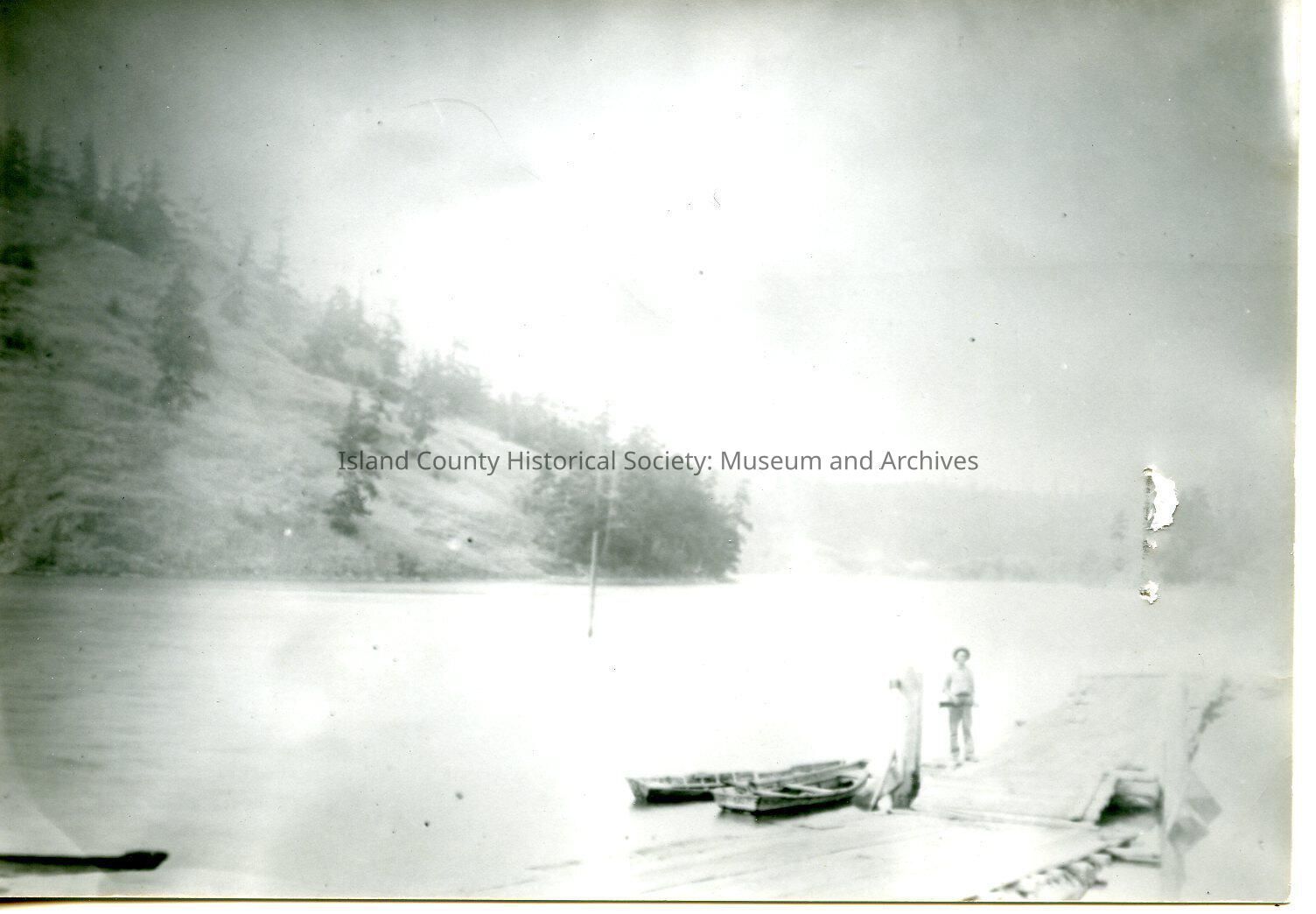 The black and white photo shows a view of Deception Pass. The bottom half of the photo shows a person wearing a hat standing on the edge of a dock. The dock has two row boats tied up to it. The middle of the photo shows a large pole. The top of the photo shows an island that is sloping down from the left side of the photo to the middle of the photo.