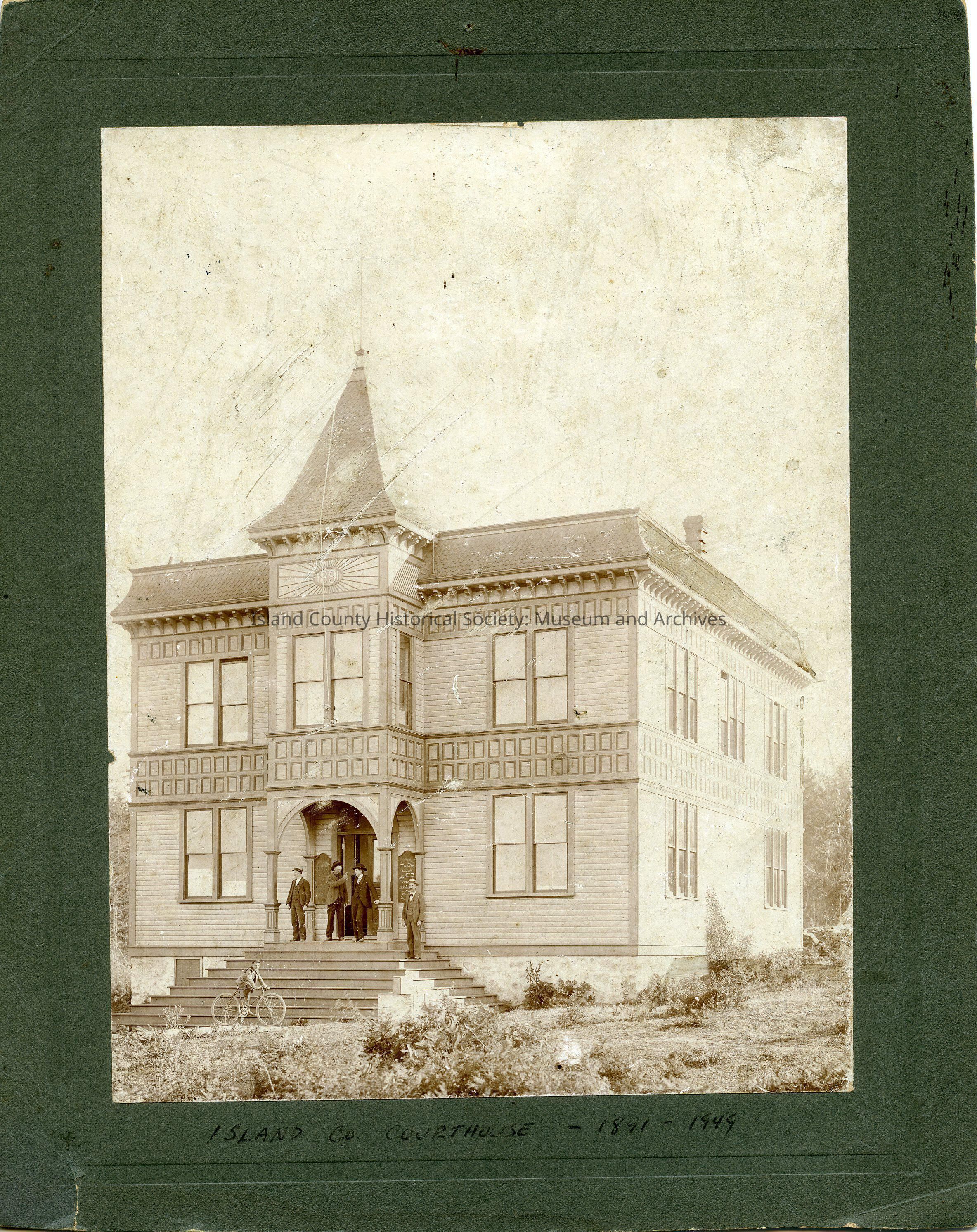 From the #61 entry in the book: Photograph of Island County Courthouse built in 1891 and used until 1949. Now destroyed except for vault which is standing two blocks east of present courthouse. Given by Joe Libbey of Coupeville.