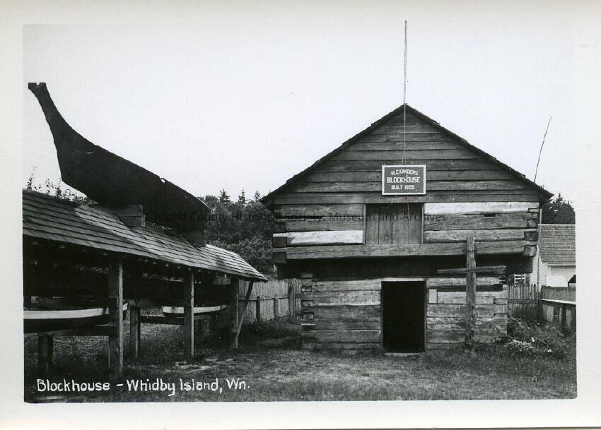 The black and white photo shows a view of the Alexander Blockhouse. Next to the Blockhouse shows a Chief Snakelum's canoe on top of the canoe storage.