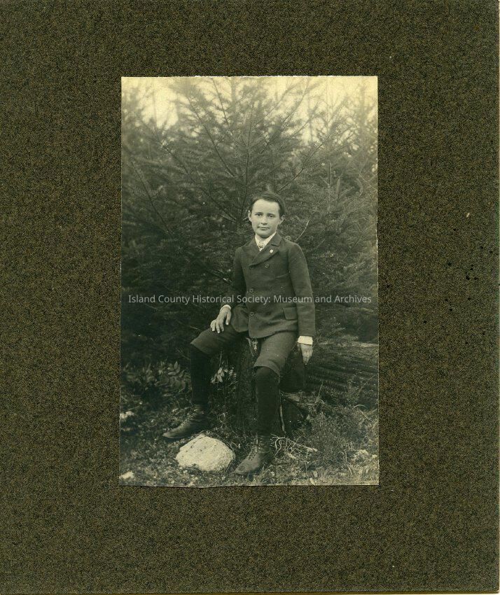 The black and white photo shows John Morgan sitting on a tree stump with a large rock in front of the tree stump. From the donor's letter: "Another picture is of a young man who appears to be between the ages of 12 and 15. On the back someone has written "1907" and "John Morgan. Oak Harbor, Wash.""