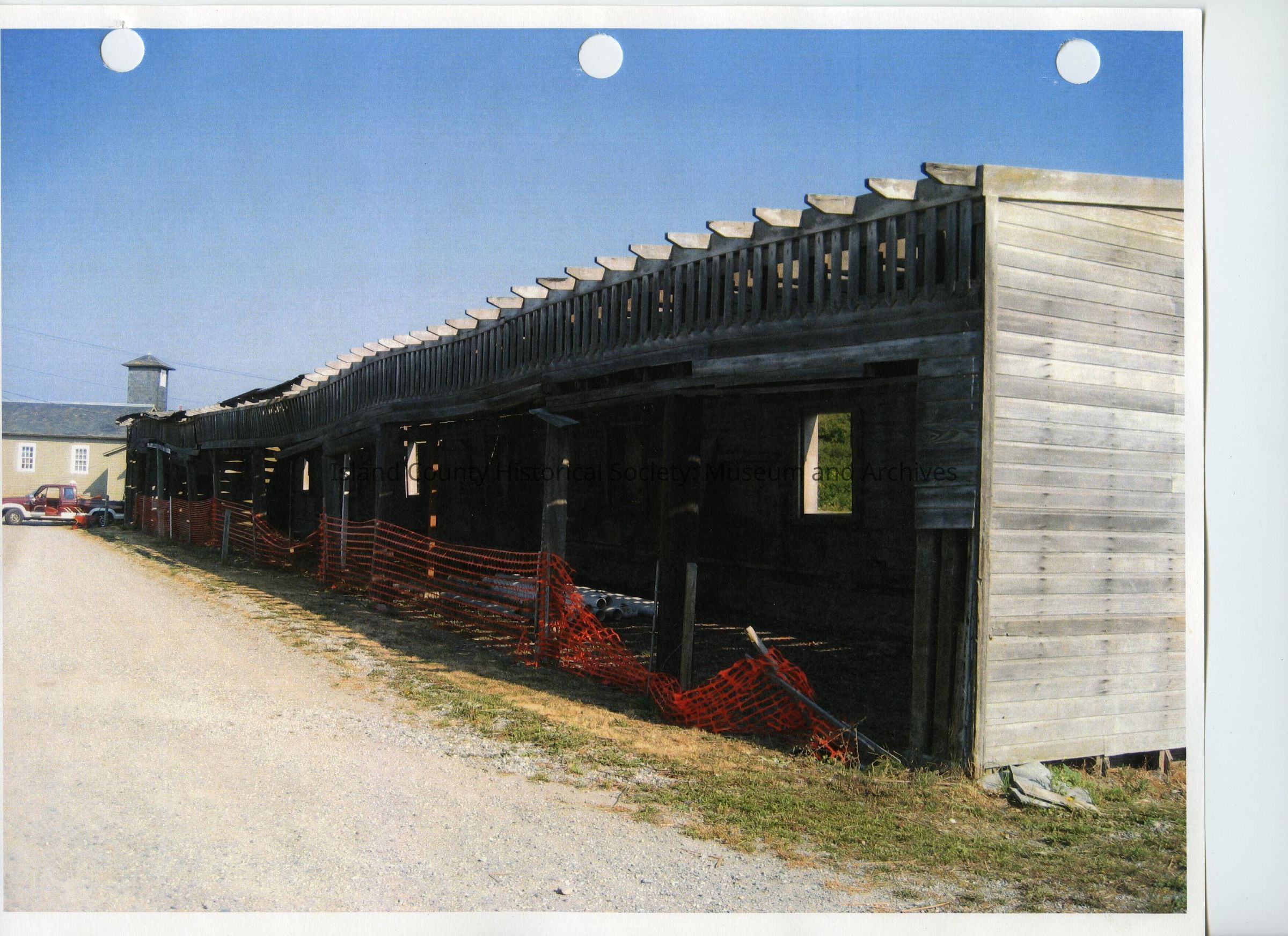 Ft. Casey fuel/mule shed full front view of shed with orange construction fence across the front.