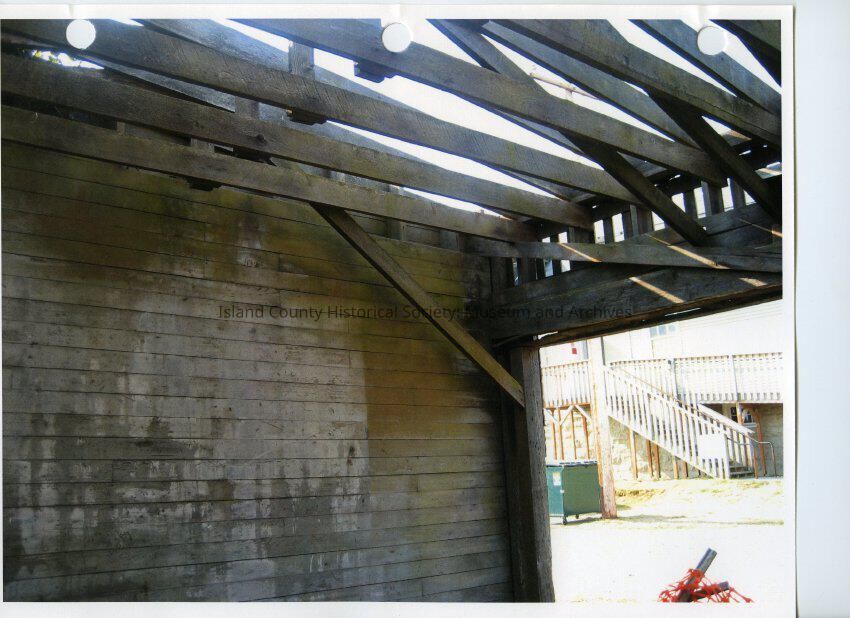Ft. Casey fuel/mule shed Photo showing one end of the mule shed and how some of the rafters are assembled.